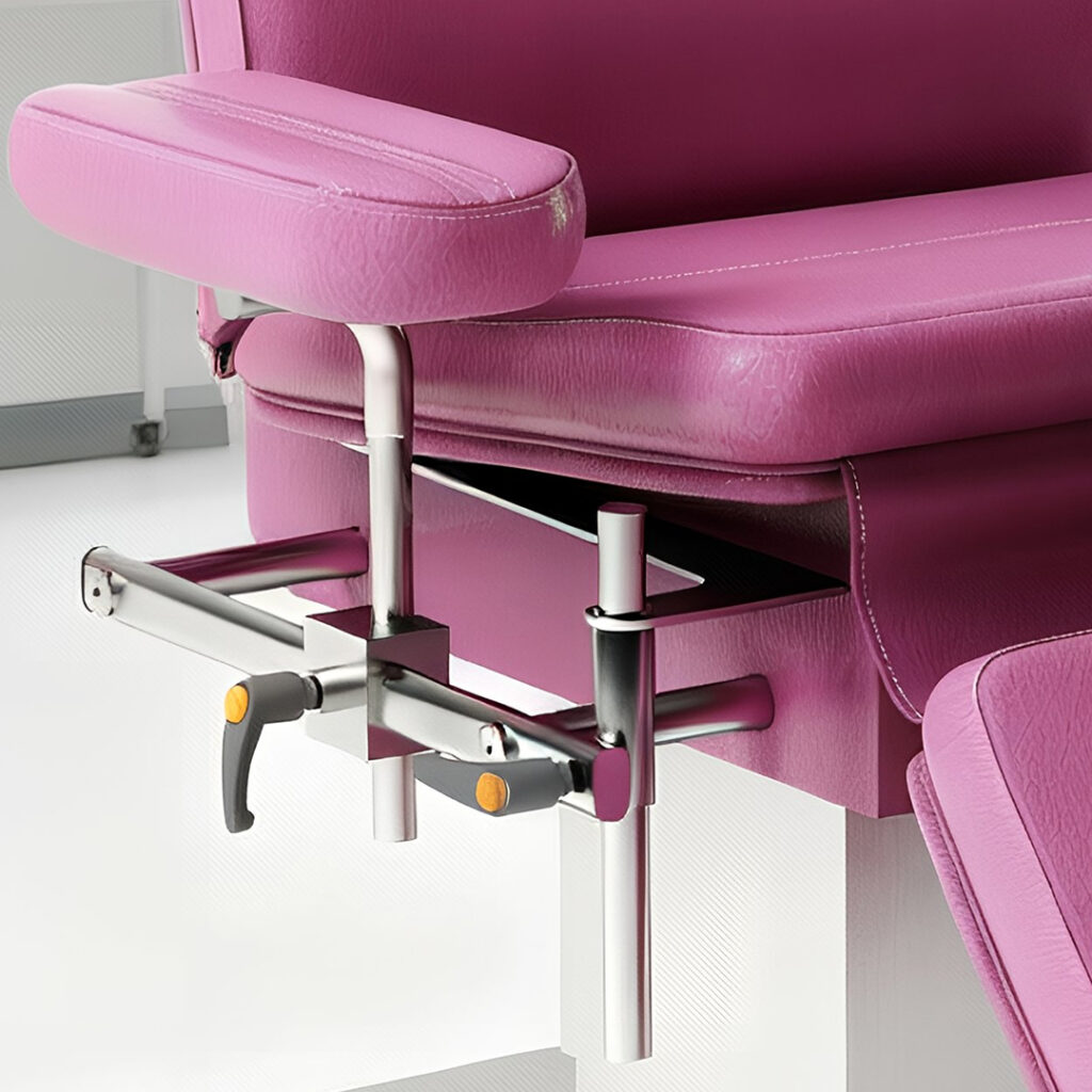 The IV pole mounts to the chair’s lateral rails with a sliding clamp or fixed mount, keeping the workspace organized and workflow efficient.